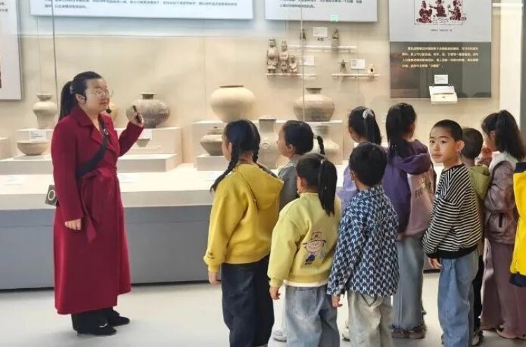 在社教老师的带领下,小朋友们走进《会水长歌——金塔古代文明寻踪》展厅,近距离观摩石壁、石琮、陶俑、陶制六畜等珍贵文物,用通俗易懂的语言讲解汉魏时期古会水地区的丧葬祭祀文化与历史内涵,让孩子们在直观感受文物魅力的同时,触摸家乡千年文明脉络,加深对本土历史文化的认知与理解。